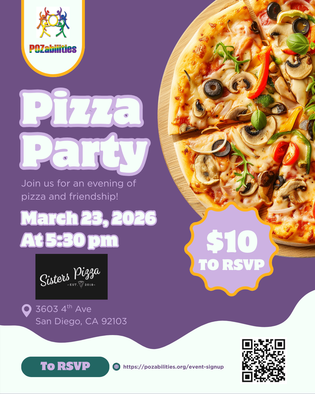 Join us for a fun evening at one of our favorite Pizza joints, Sister’s Pizza. They are huge supporters of POZabilities so we need to show them some love and visit with them.