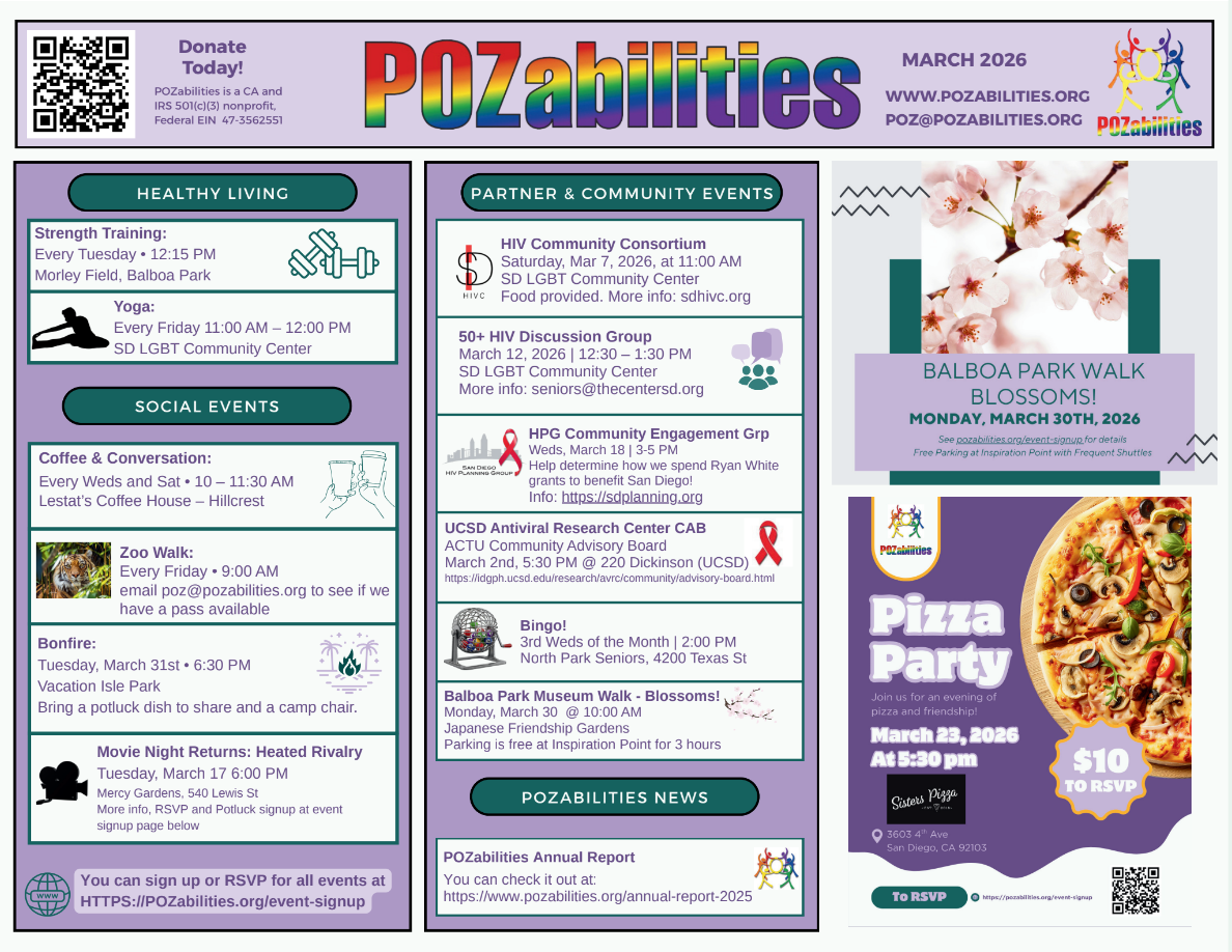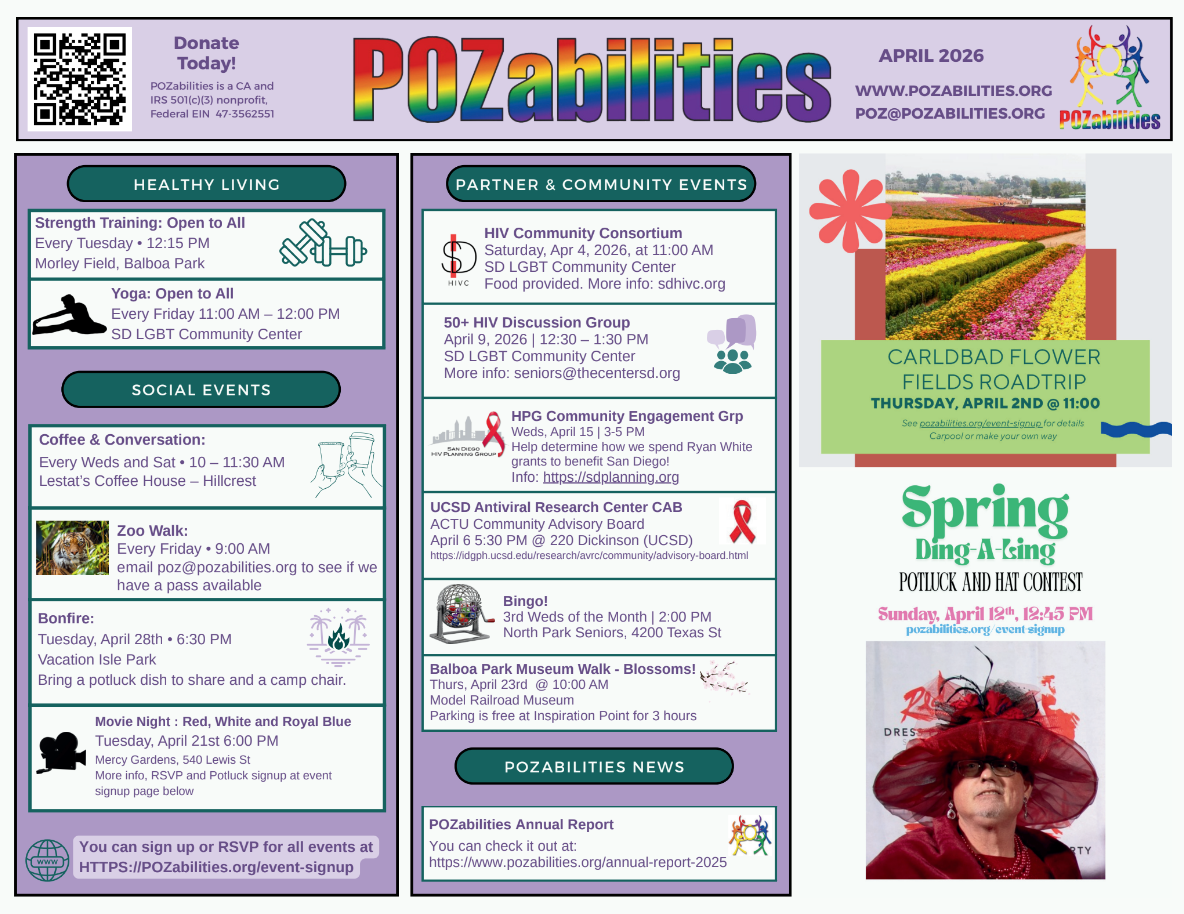 Please join your friends at POZabilities in celebrating birthdays for John and Jerry. We will also be celebrating Jerry's retirement. Free event but you must RSVP so we can arrange for enough nibbles. Donations to fund POZabilities future events will be graciously accepted. PS PRizes for the most ridiculous hats 😉